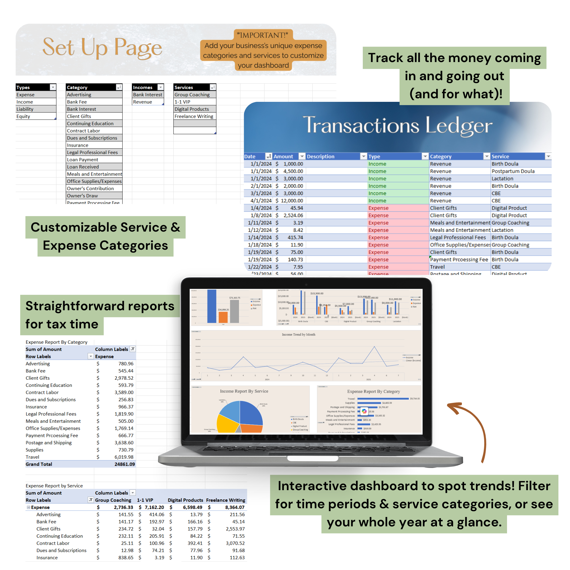It does the math for you. You’ll enter your income and expenses into the Ledger, and the Dashboard automatically totals everything—net profit, income by service, expenses by category, and more.